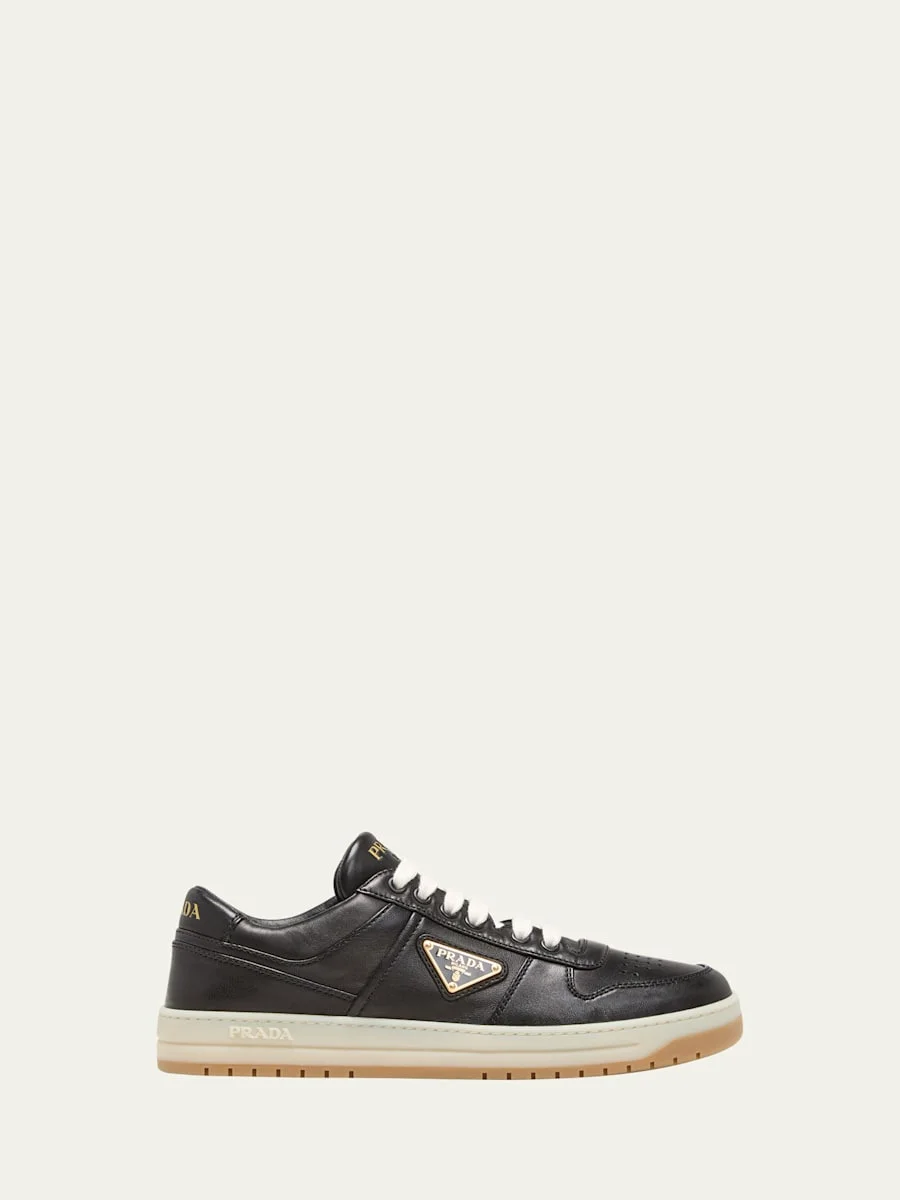 Prada leather low-top sneakers Signature logo triangle accent 1.25 in / 30 mm flat heel Round perforated toe Lace-up vamp Cushioned footbed Rubber outsole Made in Italy Online Inquiries: BGS21_X6GDJ| Store Inquiries: #4692360