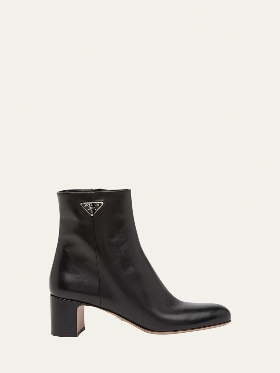 Prada lambskin leather ankle booties Logo triangle accent at side 2.25 in / 55 mm block heel Round toe Side zip eases dress Leather outsole Made in Italy Online Inquiries: BGS21_X64H7| Store Inquiries: #4546948