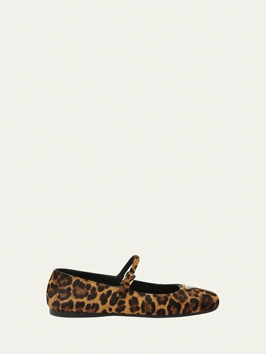 Prada leopard-print dyed calf hair (Italy) ballerina flats Signature logo triangle accent 0.17 in / 5 mm flat heel Round toe Mary Jane buckle strap Rubber outsole Professional cleaning recommended, spot clean Made in Italy Size Note: Runs true to size. Online Inquiries: BGS21_X6L78| Store Inquiries: #4794527