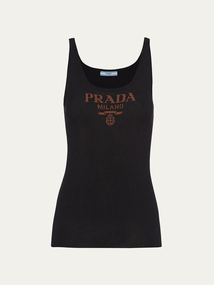 Prada knit tank top with logo print across chest Scoop neckline Sleeveless Slim fit Pullover style Silk Dry clean, professional cleaning recommended Made in Italy Model is 5'10"/177cm. Online Inquiries: BGS21_B8KEL| Store Inquiries: #4586744