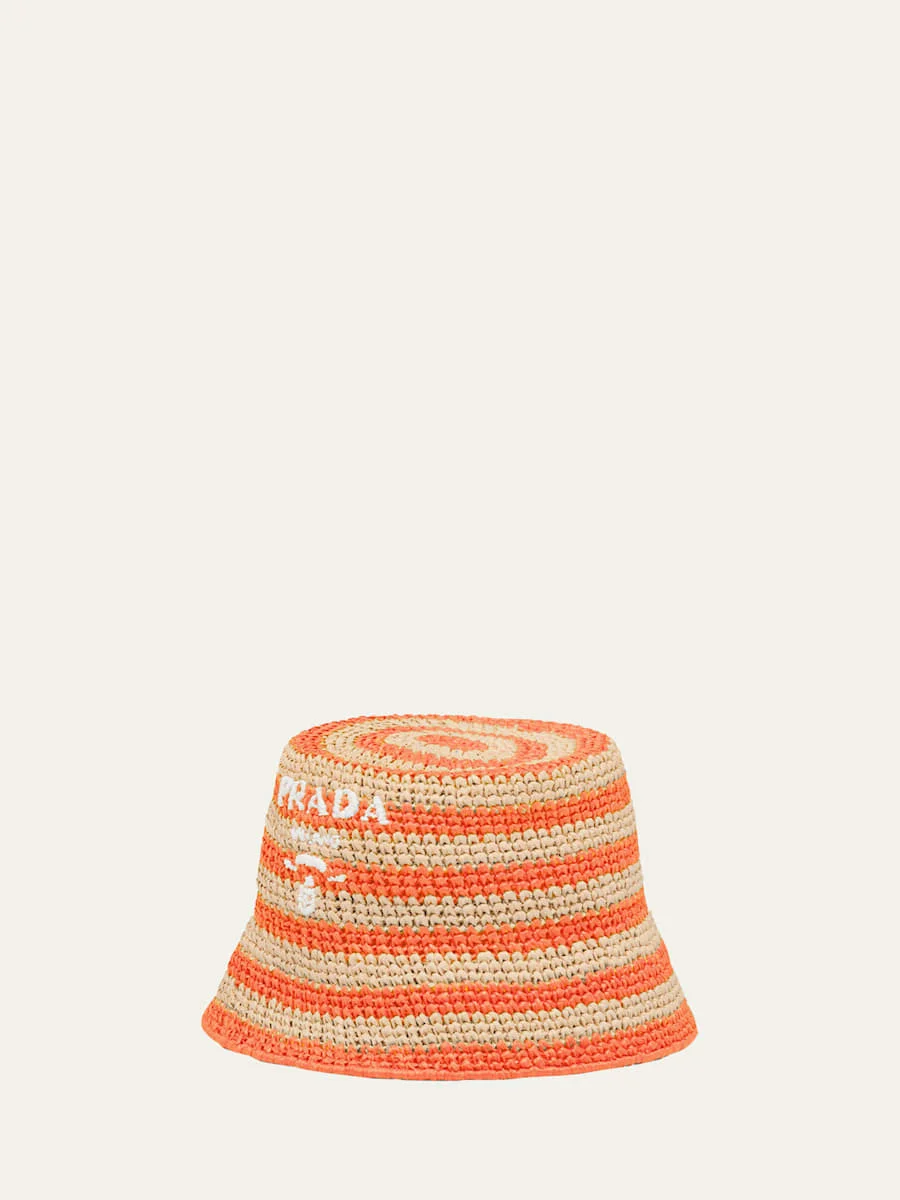 Prada striped bucket hat with woven logo Flat crown Downturned brim Raffia/viscose Made in Italy