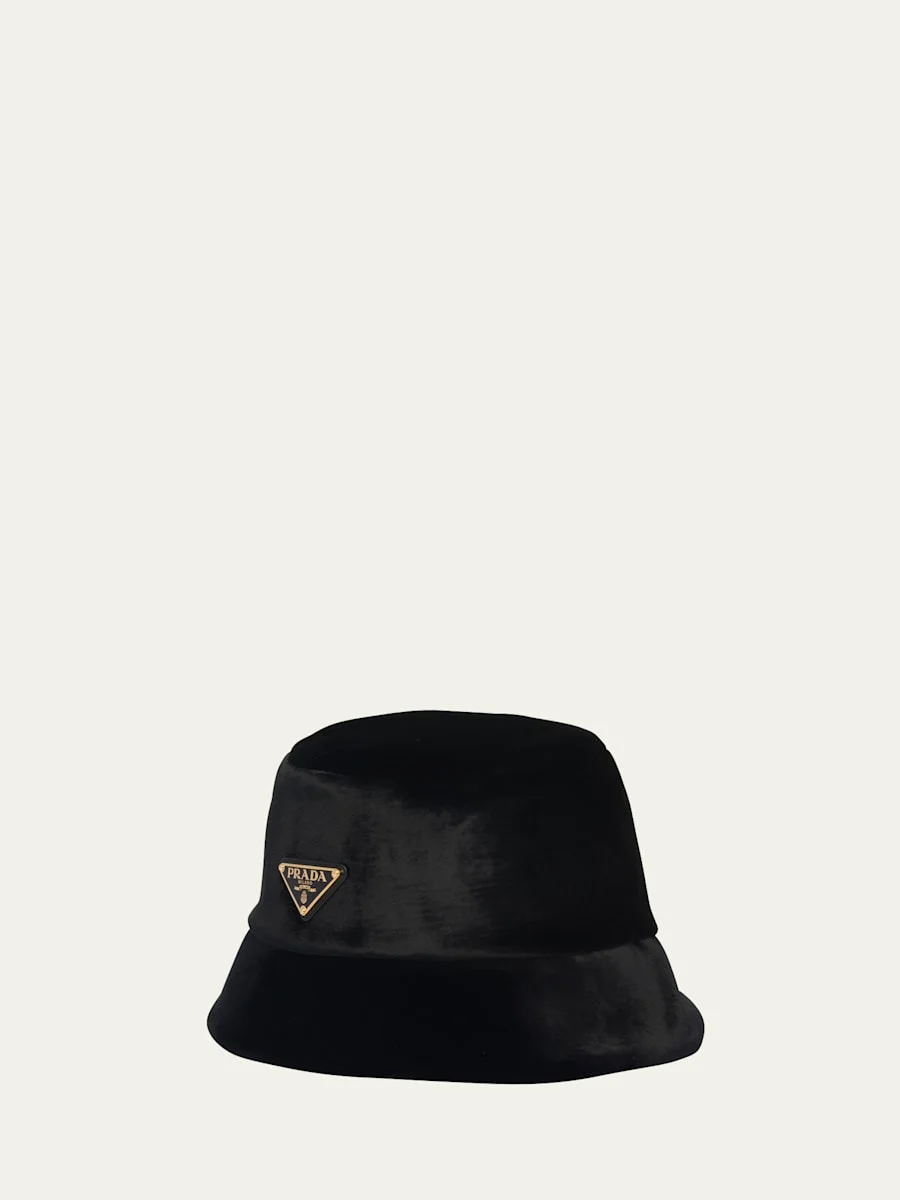 Prada bucket bag in velvet viscose Features signature triangle logo accent Flat crown Downturned brim Professional cleaning recommended Made in Italy