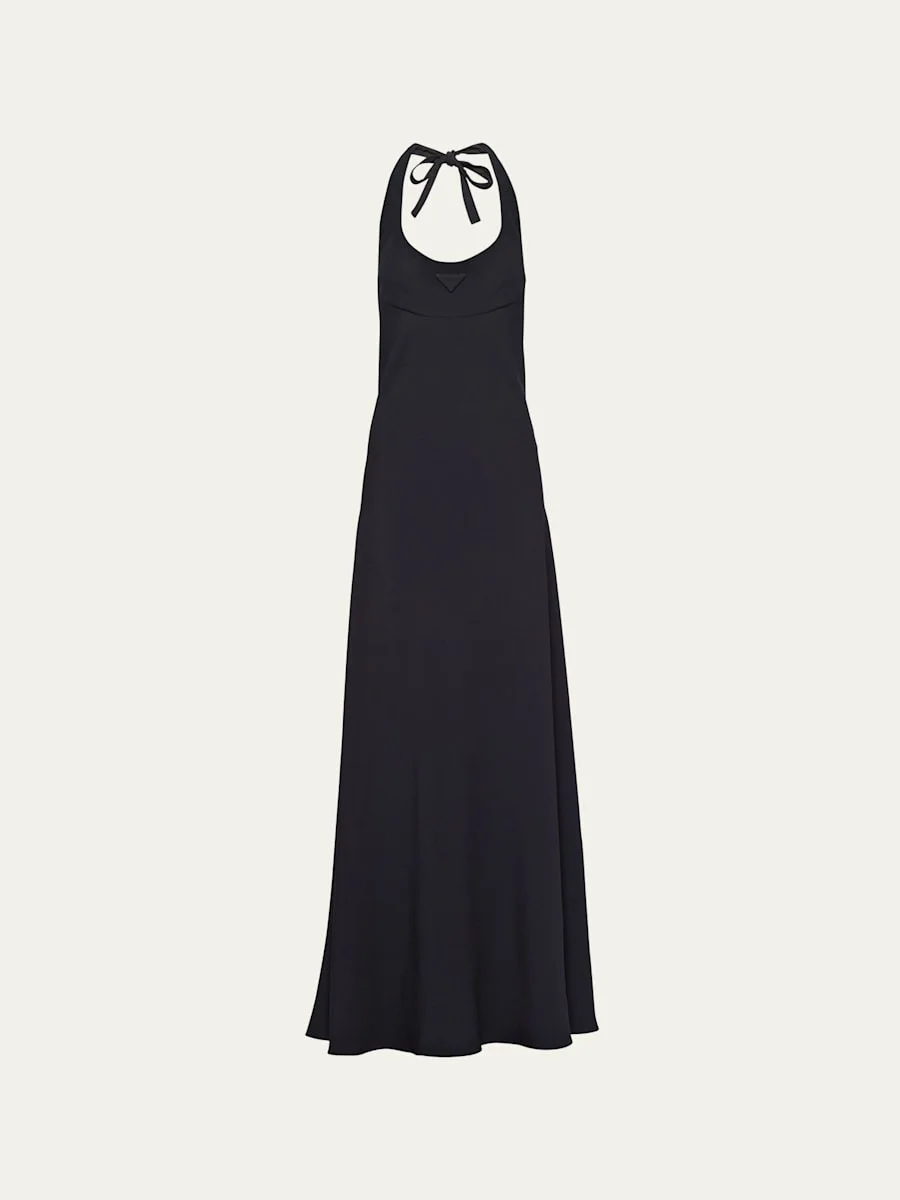 Prada sable dress with fabric triangle logo Halter neckline; self-tie at nape Sleeveless A-line silhouette Full length Back zip Acetate/viscose Dry clean, professional cleaning recommended Made in Italy Model is 5'10"/177cm. Online Inquiries: BGS21_B8KEU| Store Inquiries: #4586752