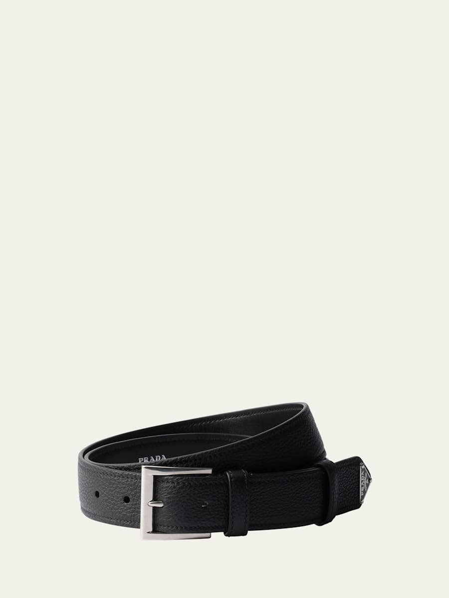 Prada belt in hammered leather with signature enamel triangle logo Adjustable length Silvertone thorn buckle Leather Made in Italy Online Inquiries: BGS21_NDDPF| Store Inquiries: #5029419
