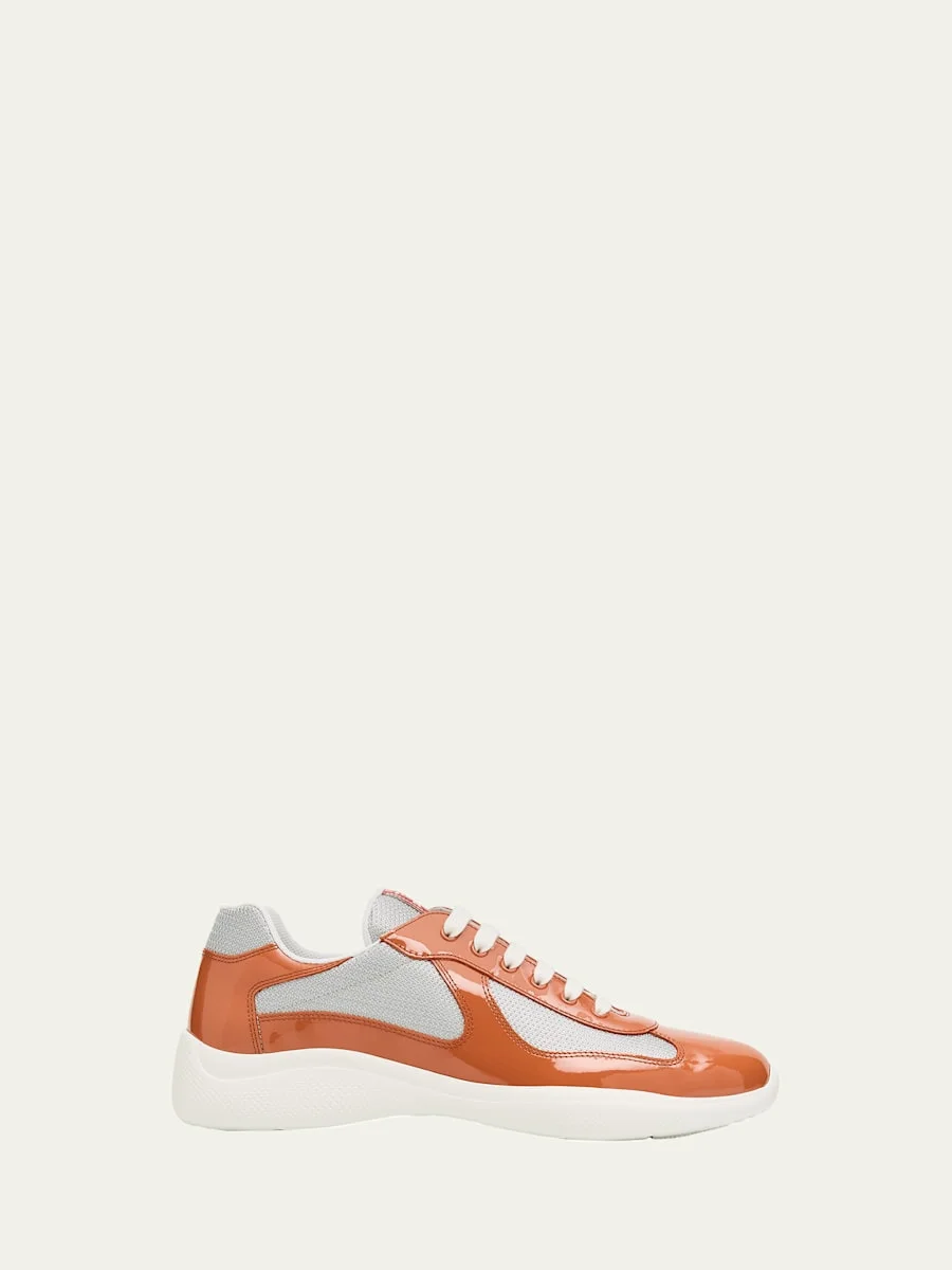 Prada patent leather sneaker in a textile design. Platform heel with logo detail. 40mm light, flexible rubber sole Round, reinforced toe. Laceup vamp. Calf leather trim. Textured rubber outsole. Spot clean. "America's Cup" is made in Italy.