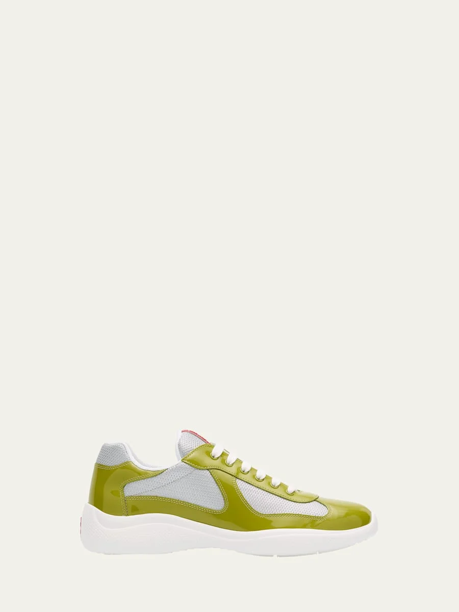 Prada patent leather sneaker in a textile design. Platform heel with logo detail. 40mm light, flexible rubber sole Round, reinforced toe. Laceup vamp. Calf leather trim. Textured rubber outsole. Spot clean. "America's Cup" is made in Italy.