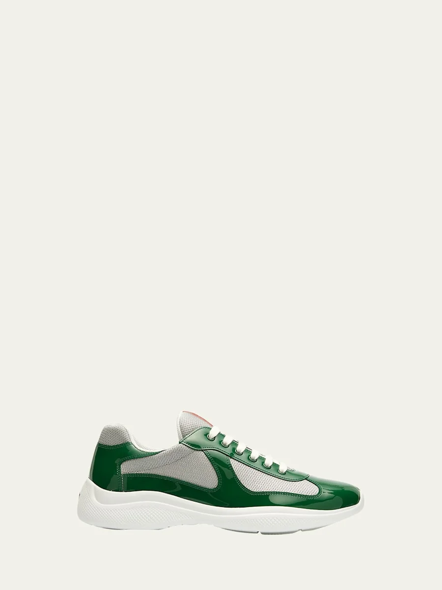 Prada patent leather sneaker in a textile design. Platform heel with logo detail. 40mm light, flexible rubber sole Round, reinforced toe. Laceup vamp. Calf leather trim. Textured rubber outsole. Spot clean. "America's Cup" is made in Italy.
