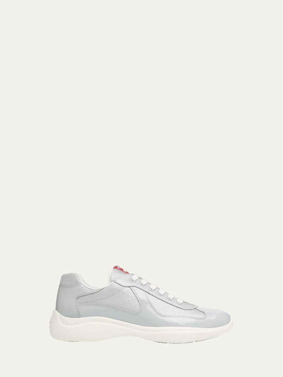 Prada patent leather sneaker in a textile design. Platform heel with logo detail. 40mm light, flexible rubber sole Round, reinforced toe. Laceup vamp. Calf leather trim. Textured rubber outsole. Spot clean. "America's Cup" is made in Italy.