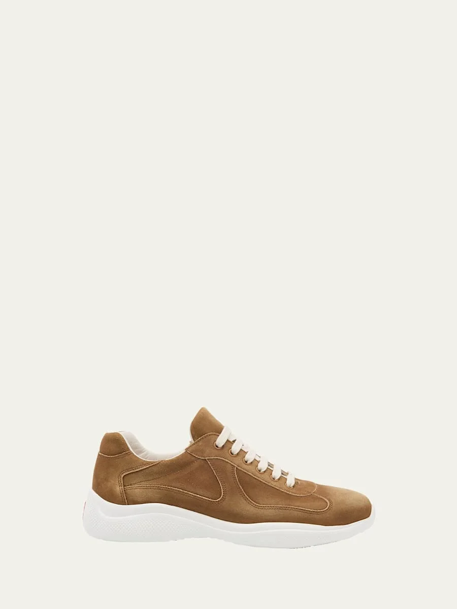 Prada "Americas Cup" low-top sneakers in suede Flat heel Reinforced round toe Lace-up vamp Branded tongue Padded collar Logo insert on heel Rubber outsole Made in Italy Online Inquiries: BGS21_NCJTB| Store Inquiries: #4894482