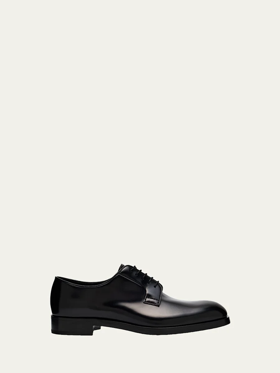 Prada derby shoes in brushed calf leather Stacked heel Almond toe Laceup vamp Rubber outsole Made in Italy