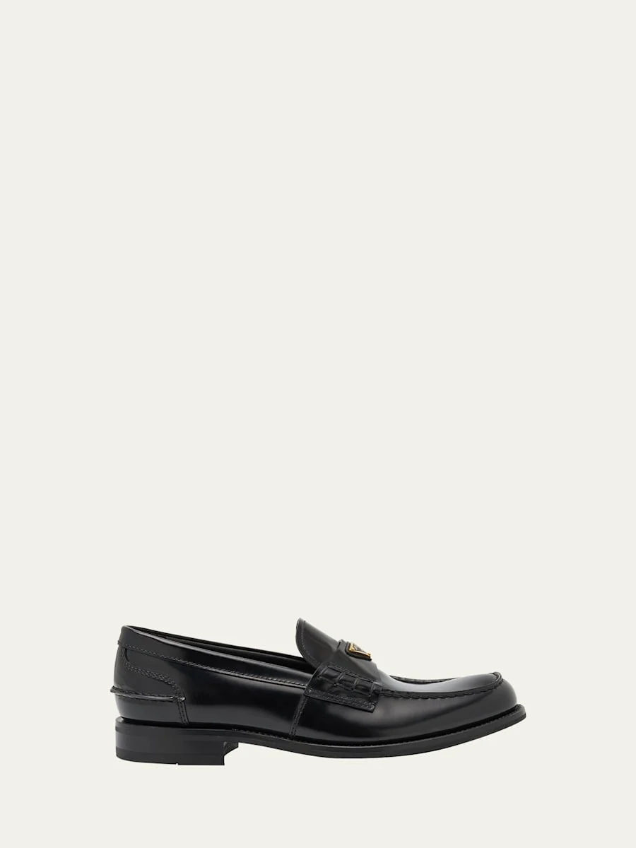 Prada loafers in brushed leather Stacked heel Round split moc toe Signature enameled metal triangle logo Rubber outsole Slip-on style Professional cleaning recommended Made in Italy Online Inquiries: BGS21_NCJTC| Store Inquiries: #4894485