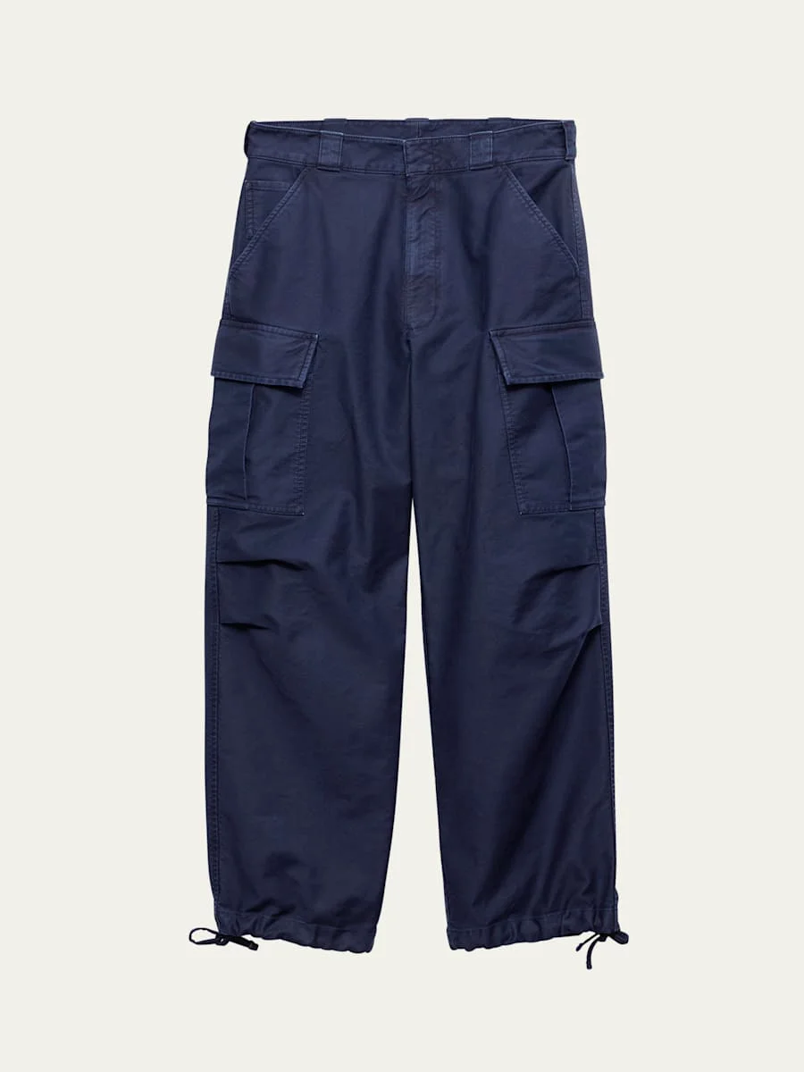 Prada Cargo pants in raso old Oversized lines and workwear-inspired details define these cotton cargo pants with a treatment that gives the fabric a worn look. Large utility pockets complete the wide-leg style decorated with the tonal triangle logo. Full length Cotton Hand wash, machine wash cold, wash inside out, wash separately Made in Italy Online Inquiries: BGS21_NDETQ| Store Inquiries: #5032143