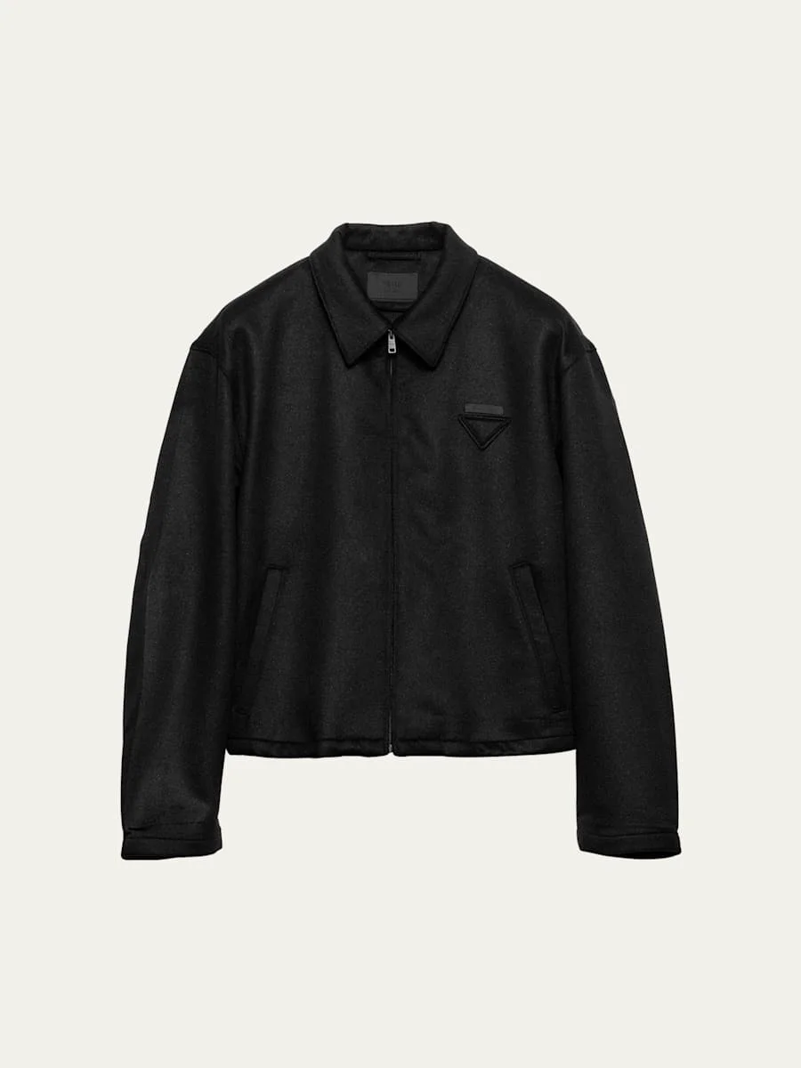 Defined with sleek details, this blouson jacket by Prada offers a pared-back silhouette crafted from a premium wool-cashmere blend Shirt collar; front zip Dropped shoulders Long sleeves; straight cuffs Chest fabric triangle logo with sartorial logo label Welt pockets Relaxed fit Elasticized drawstring hem Angora goat hair/cashgora/wool Dry clean Made in Italy Online Inquiries: BGS21_NDT49| Store Inquiries: #5079995