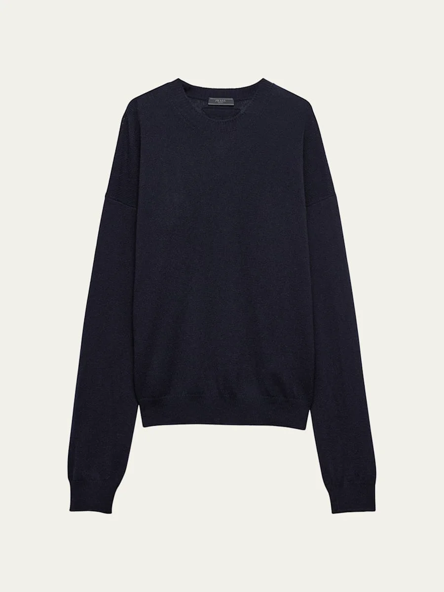Prada solid knit sweater Tonal triangle logo Crew neckline Dropped shoulders Long sleeves Ribbed trim Pullover style Cashmere Dry clean Made in Italy Online Inquiries: BGS21_NCWHV| Store Inquiries: #4965016