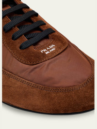 Prada "Collapse" lowtop sneakers in nylon and suede Flat heel Round toe Foiled logo on vamp Laceup vamp Elasticized collar Rubber outsole Professional cleaning recommended Made in Italy
