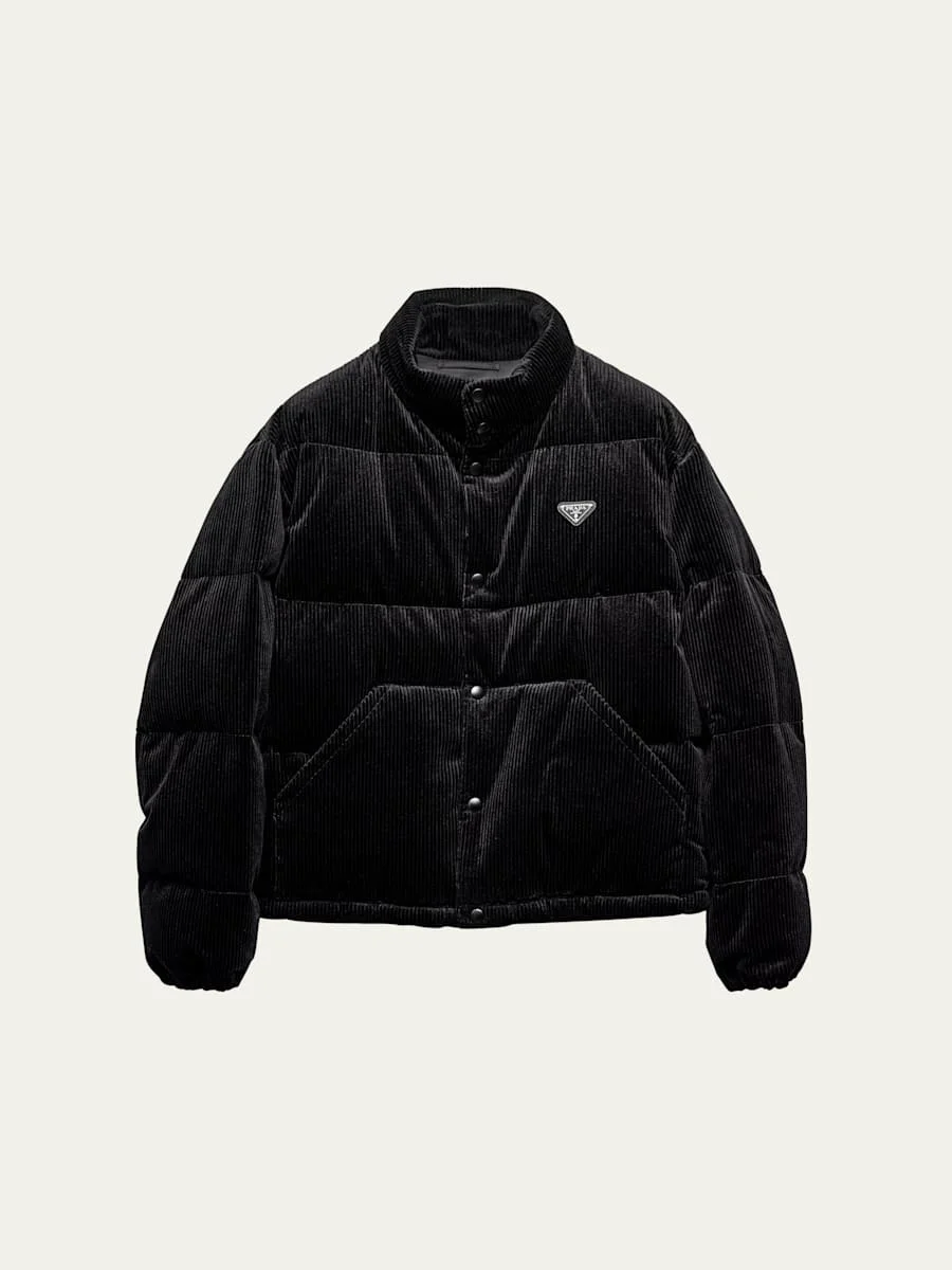Prada puffer jacket in solid corduroy Funnel neckline Tonal snap closure Enameled metal triangle logo Split pouch pocket Goose down fill Cotton Lining: Cotton Made in Italy Online Inquiries: BGS21_NCM7V| Store Inquiries: #4915643