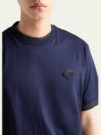 Prada classic cotton poplin T-shirt is reinterpreted with layering and contrasts that add a new touch to the sporty silhouette Decorated with the emblematic fabric triangle logo on the left chest Crew neckline Short sleeves Pullover style Relaxed fit Cotton Hand wash inside out, separately Made in Italy Online Inquiries: BGS21_NDE9Y| Store Inquiries: #5029700