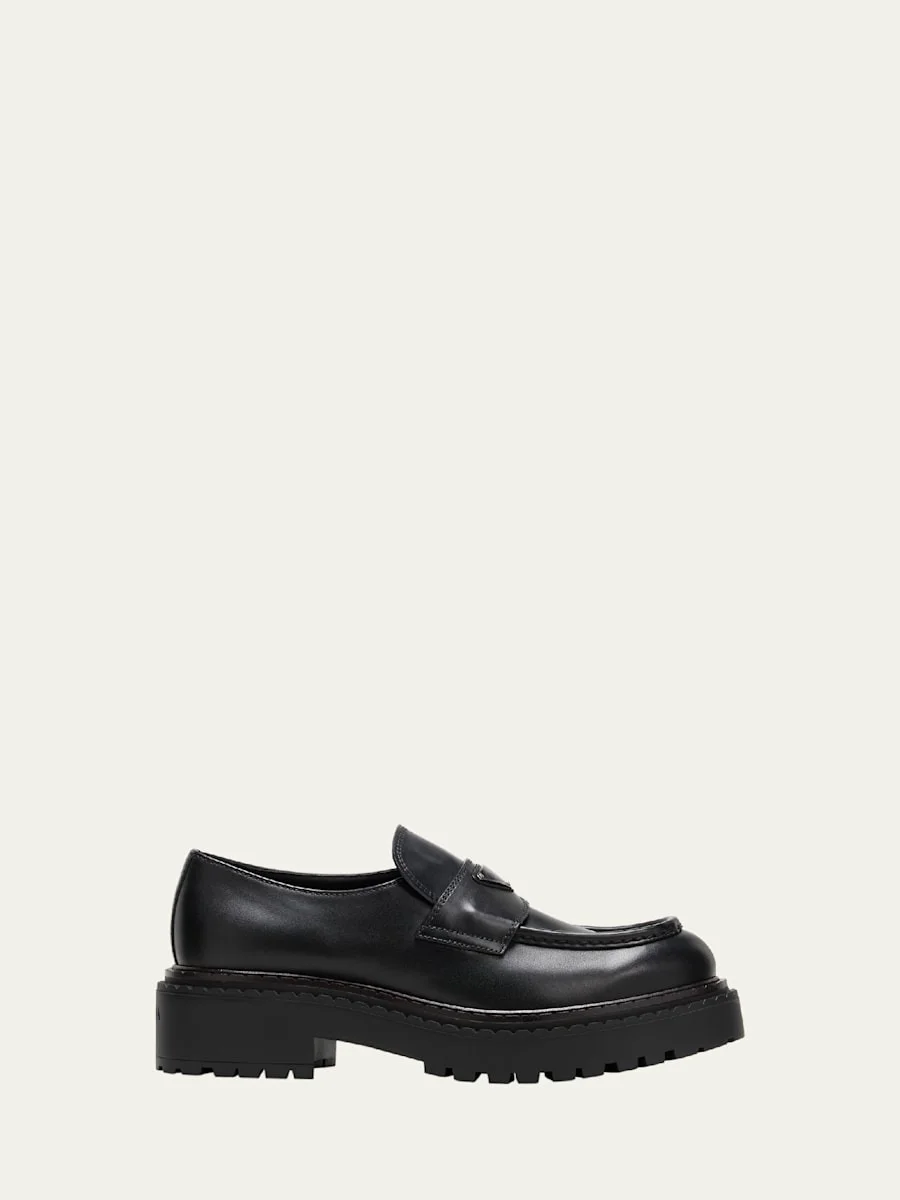 Prada "Double Chocolate" penny loafers in calf leather Leather keeper strap with the signature enameled triangle logo Chunky heel Round moc toe Heel logo Lugged rubber outsole Slip-on style Made in Italy Online Inquiries: BGS21_NC92F| Store Inquiries: #4834169