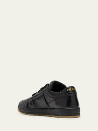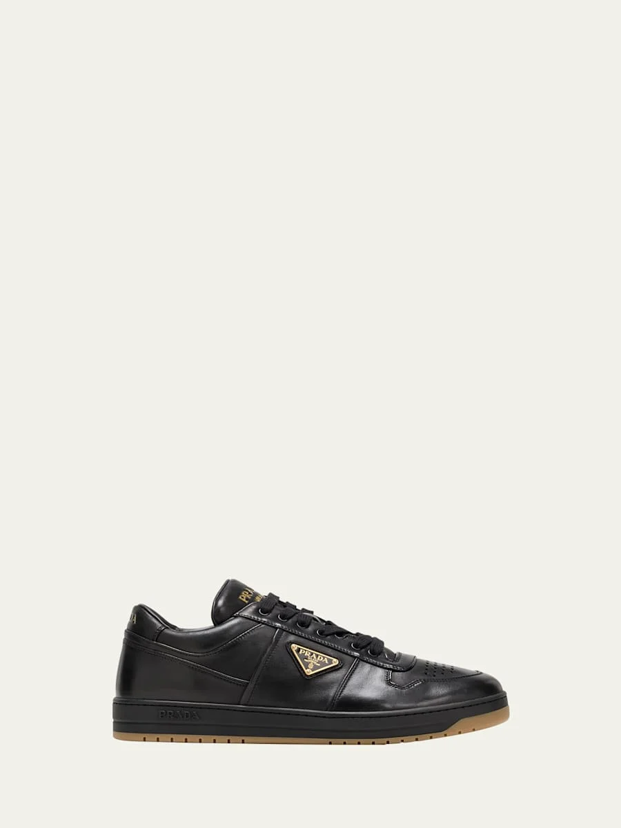 Prada "Downtown" lowtop sneakers in napa leather Flat heel Perforated round toe Laceup vamp Foiled logo on tongue and backstay Side with signature enameled triangle logo Embossed logo on midsole Rubber outsole Made in Italy