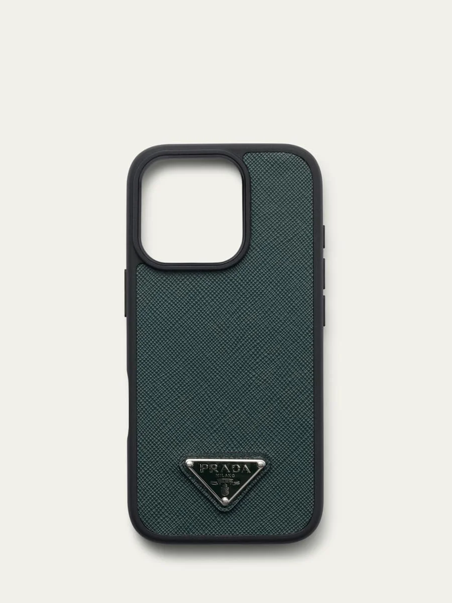 Prada leather phone case Features signature triangle logo accent Compatible with iPhone 16 Pro Wipe clean Made in Italy