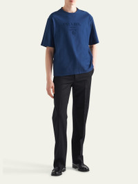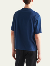 Prada jersey T-shirt with tonal terry logo at chest Crew neckline Short sleeves Classic fit Pullover style Cotton/nylon Made in Italy Model is 6'1"/185cm. Online Inquiries: BGS21_NC4ZY| Store Inquiries: #4807286