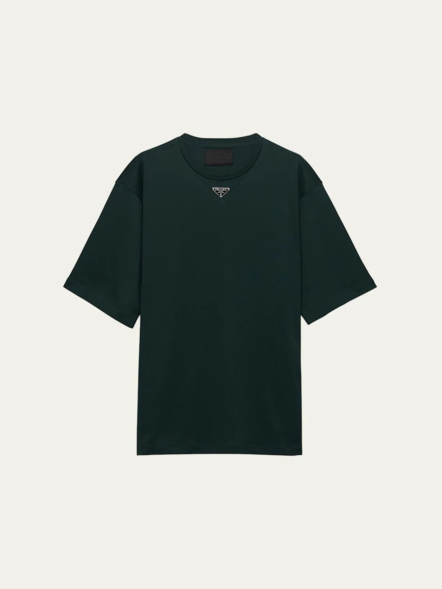 Prada Tshirt in solid jersey Enameled metal triangle logo at collar Crew neckline Short sleeves Pullover style Cotton Made in Italy