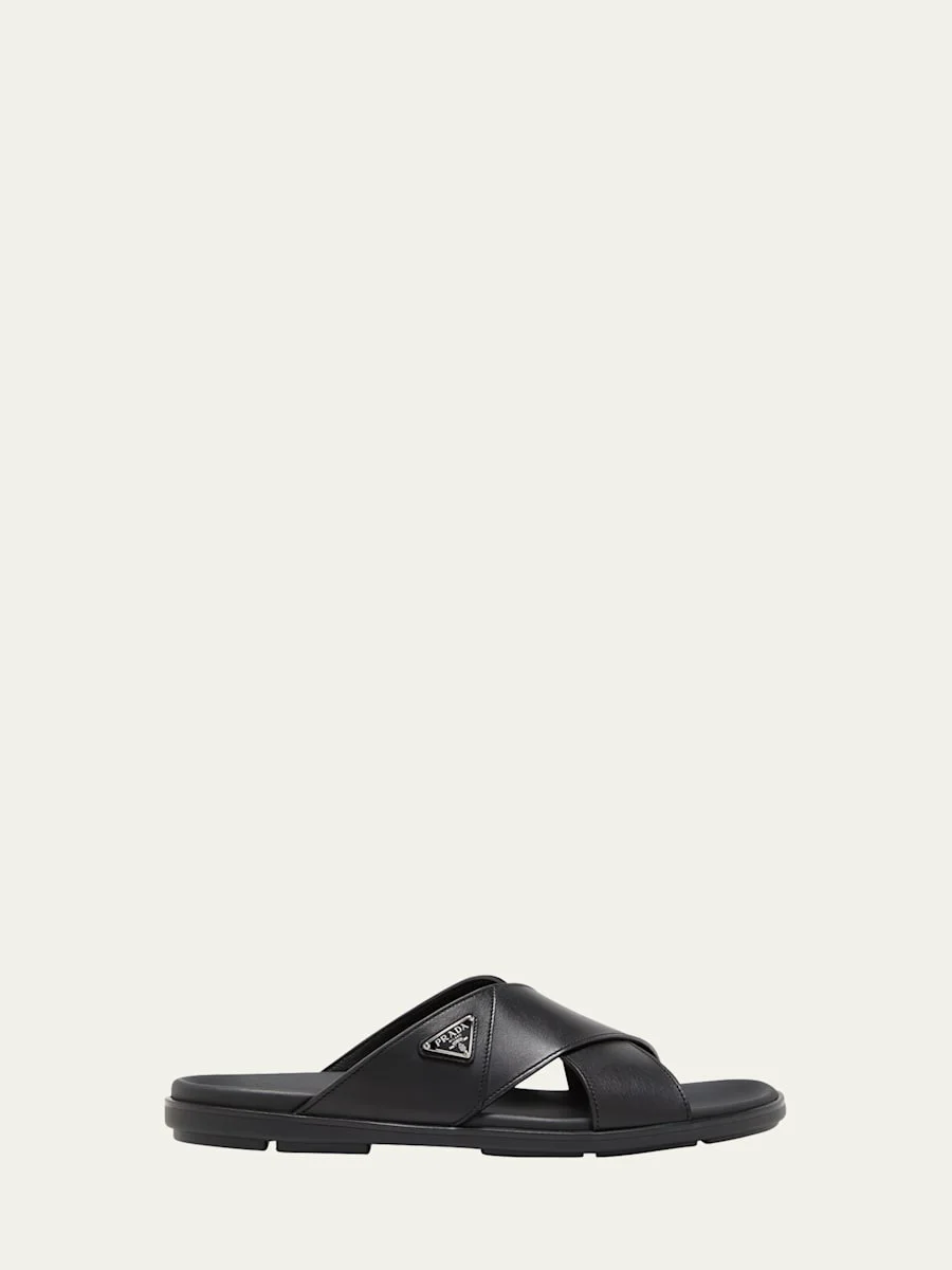 Prada sandals in leather featuring the iconic enameled metal triangle logo on the side Flat heel Open toe Crisscross vamp Easy slide style Rubber outsole Professional cleaning recommended Made in Italy