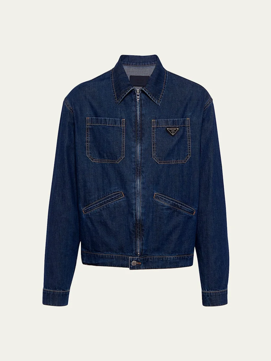 Prada jacket in lightweight denim with a washed finish Contrast stitching Point collar Front zipper and button closure Patch pockets at chest Low welt pockets Enameled metal triangle logo at chest Long sleeves with buttoned cuffs Cotton Trim: Leather Made in Italy Model is 6'1"/185cm. Online Inquiries: BGS21_NBXW2| Store Inquiries: #4738417