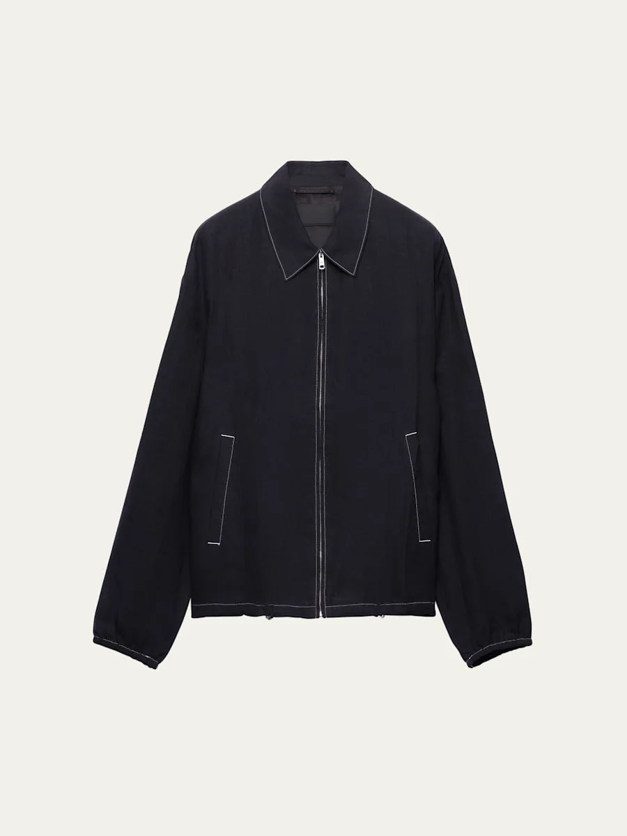 This blouson jacket with a sleek, sophisticated cut embodies a refined, contemporary style. Contrasting top-stitching emphasizes the clean lines of the silhouette completed by a zipper closure that adds a sporty note. Prada linen jacket embellished with contrast topstitching Spread collar Long sleeves Side pockets Blouson fit Zip-front Linen Lining: Viscose Dry clean Made in Italy Online Inquiries: BGS21_ND2R0| Store Inquiries: #5006955