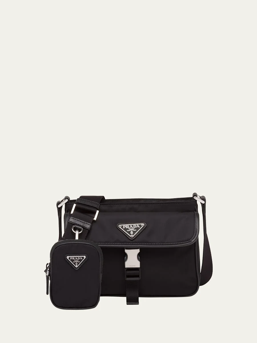 Prada crossbody bag in renylon and Saffiano leather with enameled triangle logo details Adjustable crossbody strap with a removable zip pouch Exterior, one flap pocket with siderelease buckle Approx. 5"H x 7.5"W x 1"D Made in Italy