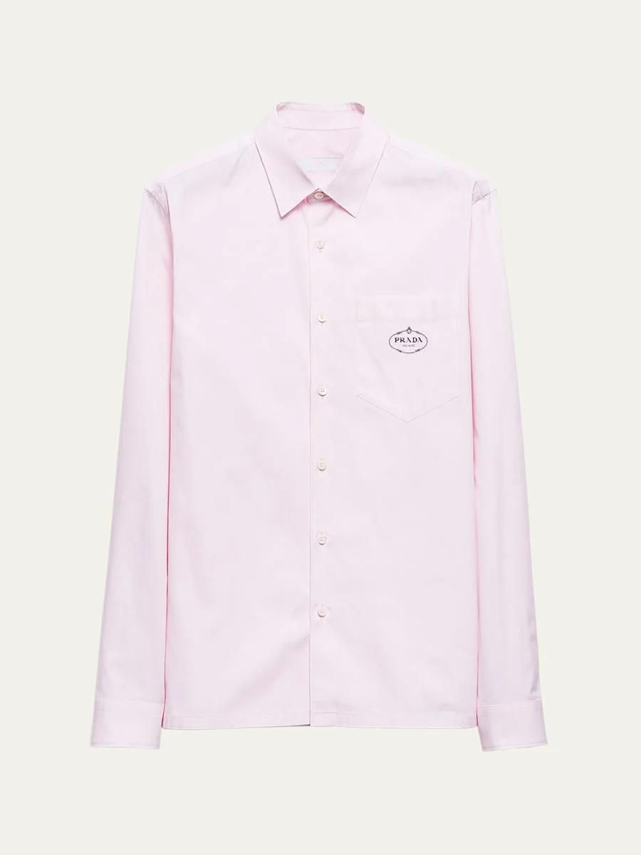 Prada dress shirt cut from solid oxford cloth Point collar Button front closure Chest pocket with logo print Long sleeves Rounded barrel cuffs Straight hem Cotton Made in Italy Online Inquiries: BGS21_NCM7T| Store Inquiries: #4915641