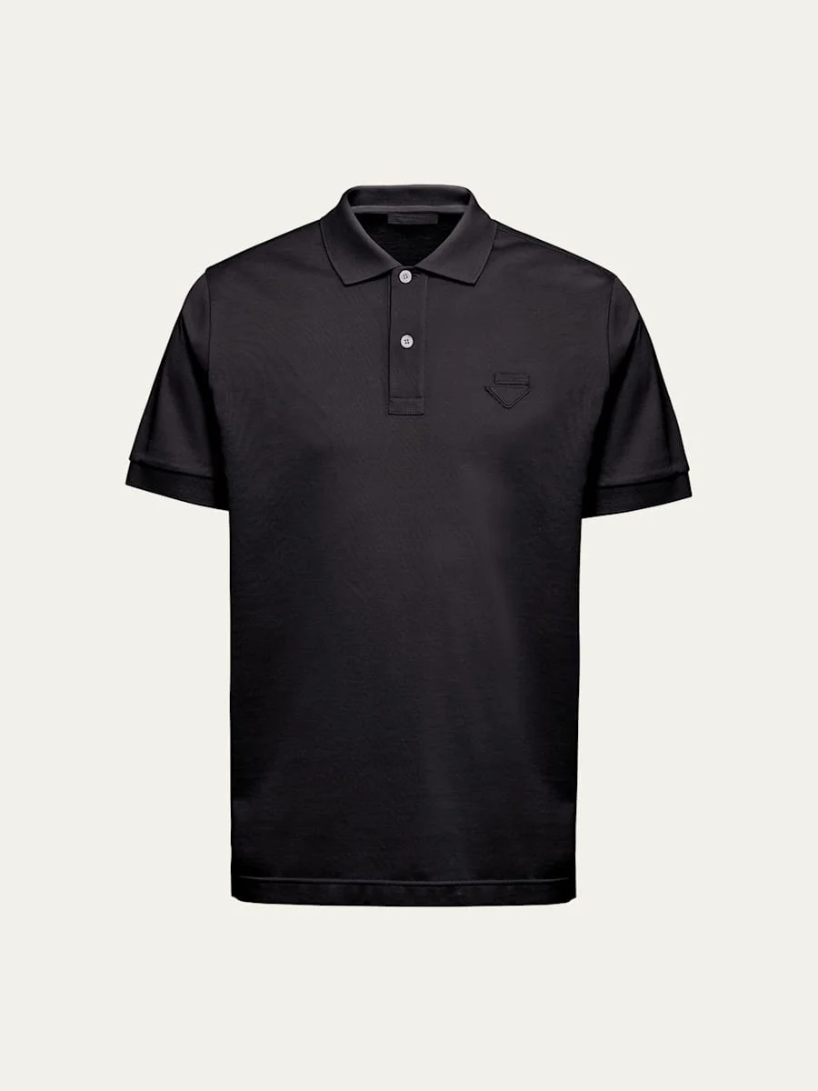 Prada polo shirt in solid piqué Spread collar; two-button placket Fabric triangle logo at chest Short sleeves Pullover style Cotton Made in Italy Model is 6'1"/185cm. Online Inquiries: BGS21_NC18Z| Store Inquiries: #4782763