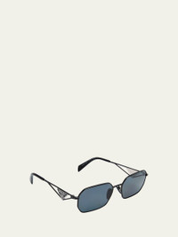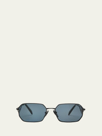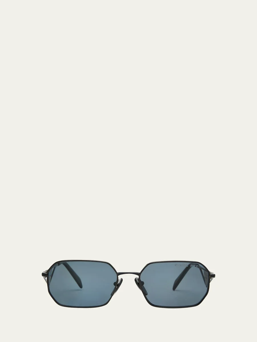 Prada "0PR A51S" rectangle sunglasses in lightweight steel Lens/bridge/temple (in mm): 5817140 Features the iconic enameled triangle on the temples Polarized lenses Left lens logo script Adjustable nose pads Tapered arms Curved, capped temple tips Steel/plastic Spot clean 100% UVA/UVB protection Made in Italy