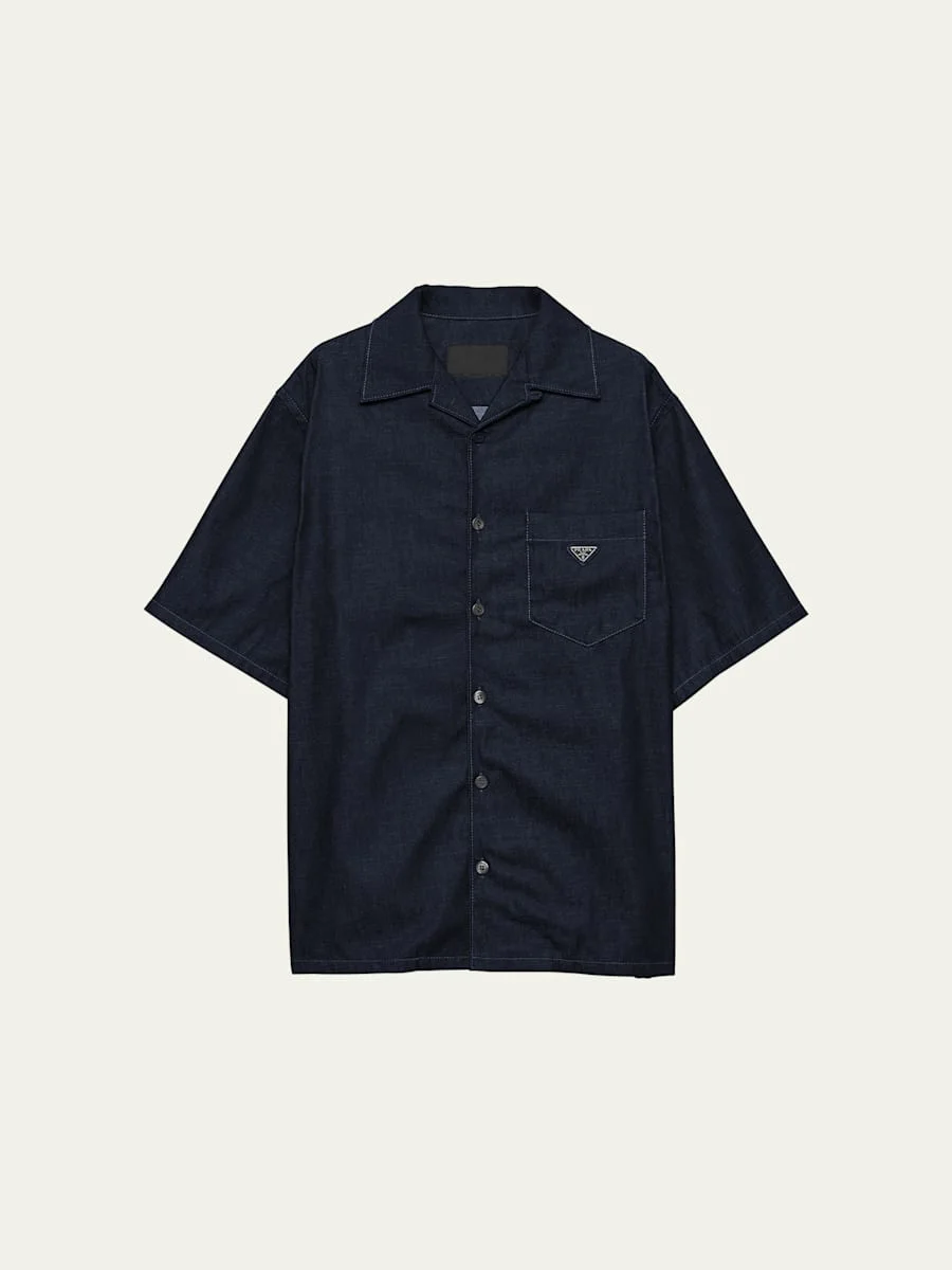 Prada shirt in raw denim, highlighted with the iconic enameled metal triangle on the chest pocket Notch collar Button front Short sleeves Straight hem Boxy fit Cotton Dry clean Made in Italy