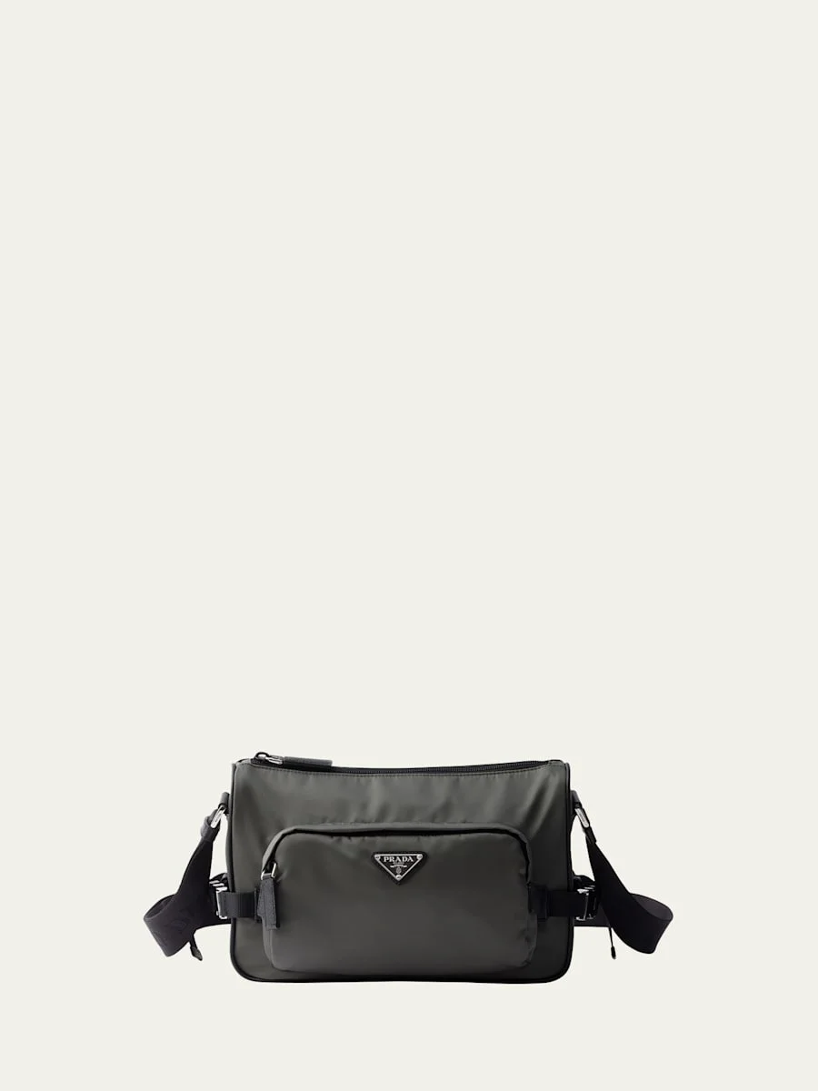 Prada crossbody bag in ReNylon Features signature enameled metal triangle logo Adjustable fabric logo strap Front zip pocket with adjustable side buckles Renylon lining Zip top closure Approx. 11"W x 6.9"H x 3.9"D Made in Italy
