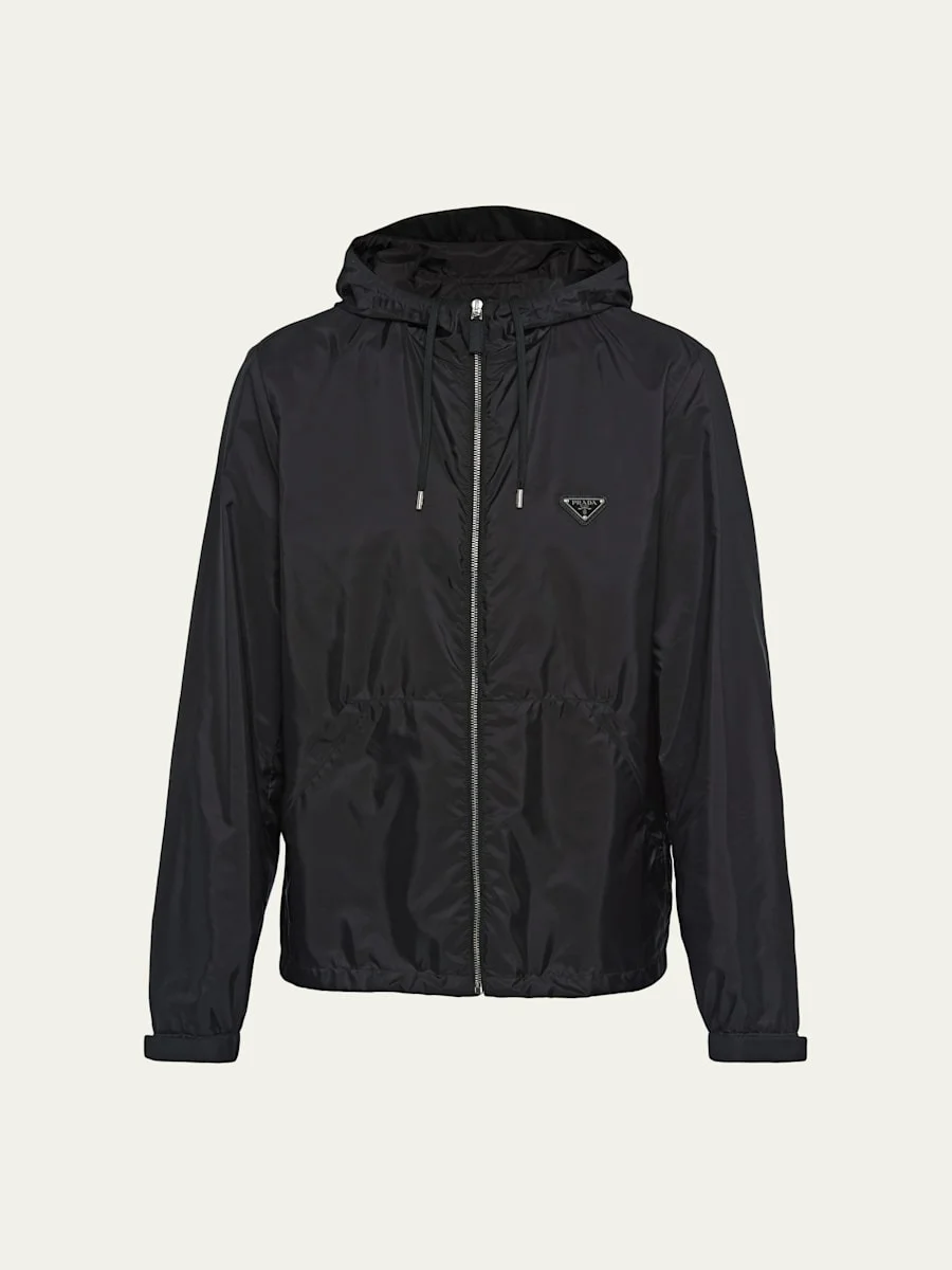 Sporty inspiration characterizes this Prada jacket made of ReNylon, a regenerated fabric produced from recycled and purified plastic materials collected from the ocean. Iconic enameled metal triangle logo on the front Hooded drawstring neckline Fullzip front Split kangaroo pouch pocket Grip strap cuffs Regular shoulder Elasticized drawstring hem Partially lined with recycled fabric Regular fit Imported Nylon/polyamide Machine wash cold Made in Italy