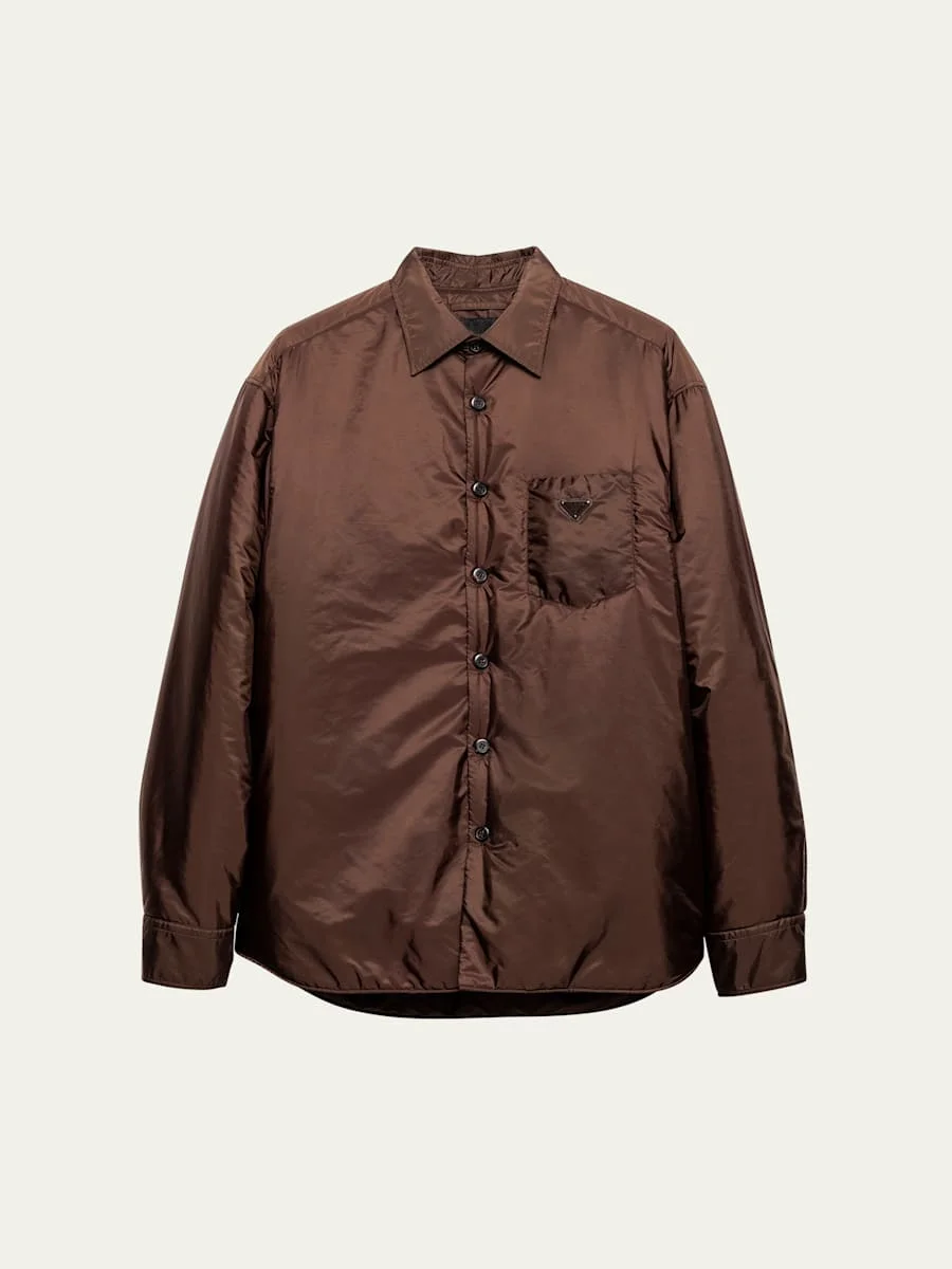 Prada nylon overshirt highlighted with the iconic enameled metal triangle on the chest pocket Point collar Button front Long sleeves Curved hem Re-nylon fill Nylon Made in Italy Online Inquiries: BGS21_NDT4C| Store Inquiries: #5079998