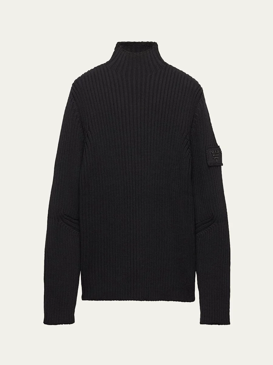 Prada sweater in solid rib knit Mock neck Dropped shoulders Long sleeves Tonal logo patch Articulated front sleeves Pullover style Wool Dry clean Made in Italy