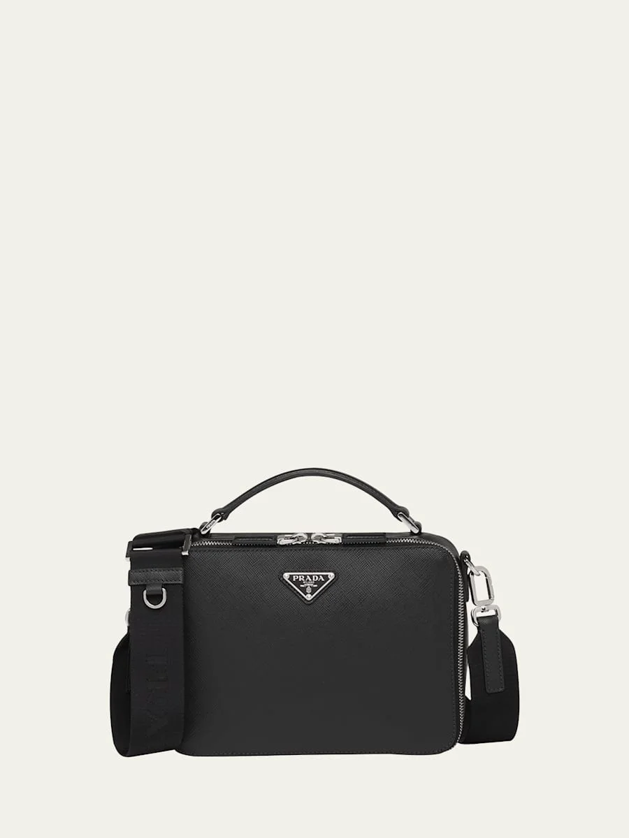 Prada "Brique Bag" crossbody bag in iconic Saffiano leather featuring signature enameled metal triangle logo at front May be styled multiple ways Top handle carry Detachable adjustable woven nylon/leather shoulder strap Double zip closure Internal slip pocket; logo patch Nylon lining Made in Italy Online Inquiries: BGS21_N84T2| Store Inquiries: #4059233