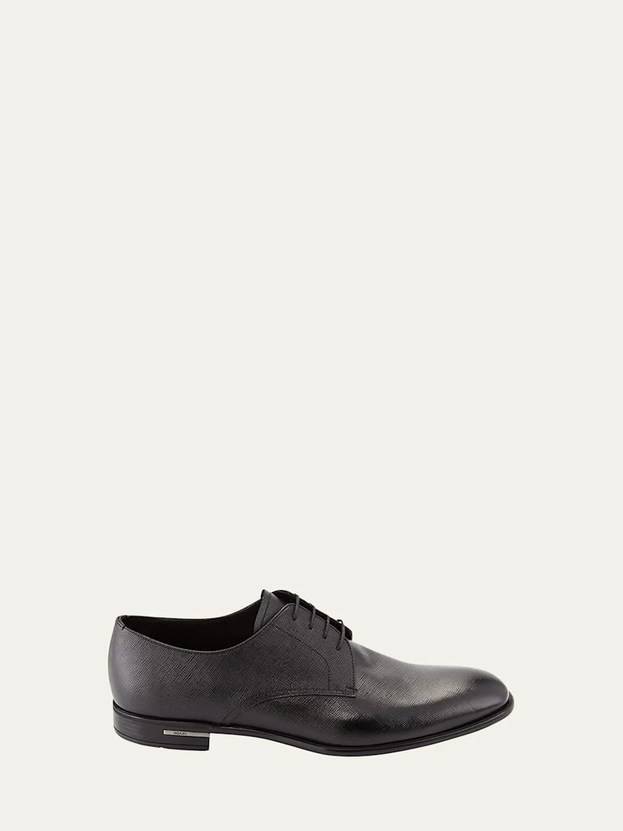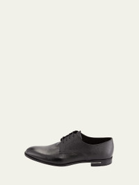 Prada saffiano textured leather shoe. Round toe; tonal topstitching. Lace-up front. Leather footbed. Comfort rubber outsole. 1" stacked heel. Made in Italy. Sizing Note: Runs large; order next size down. Online Inquiries: BGS21_N2W68| Store Inquiries: #202401