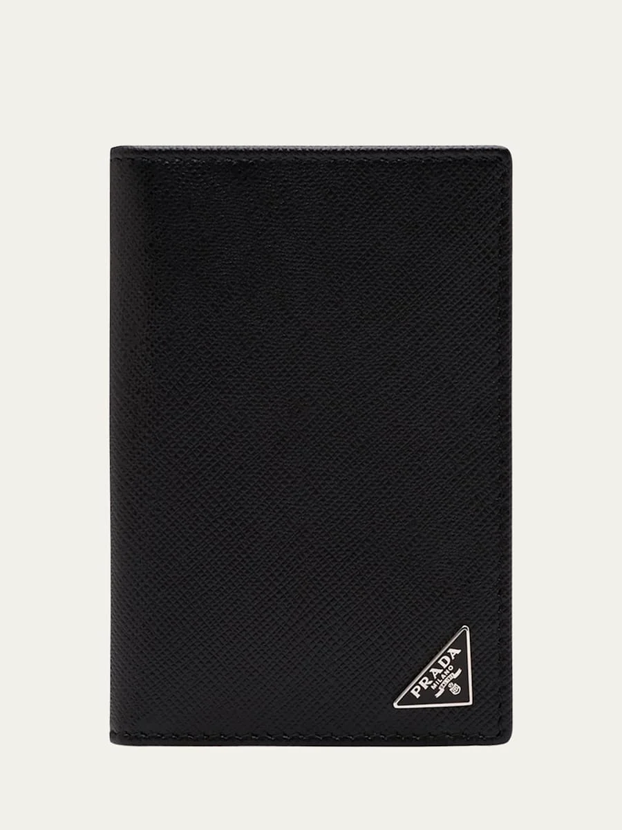 This compact Prada card holder has a practical slim design. Crafted from durable Saffiano leather, it opens to reveal six card slots and two pockets. Adorned with metal Prada logo lettering. Fully lined in moire and saffiano leather. Approx. 4.3"H x 2.7"W. Made in Italy.