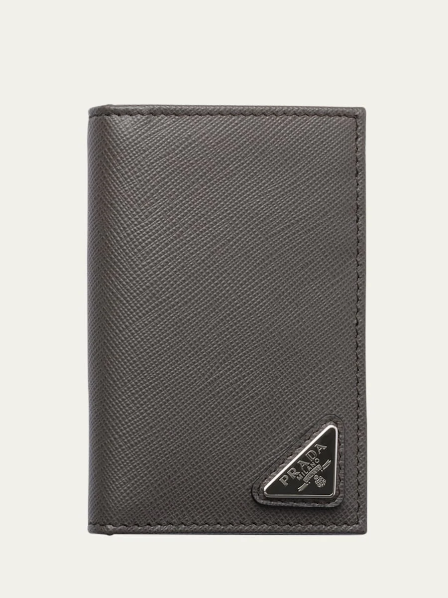 This compact Prada card holder has a practical slim design. Crafted from durable Saffiano leather, it opens to reveal six card slots and two pockets. Adorned with metal Prada logo lettering. Fully lined in moire and saffiano leather. Approx. 4.3"H x 2.7"W. Made in Italy.