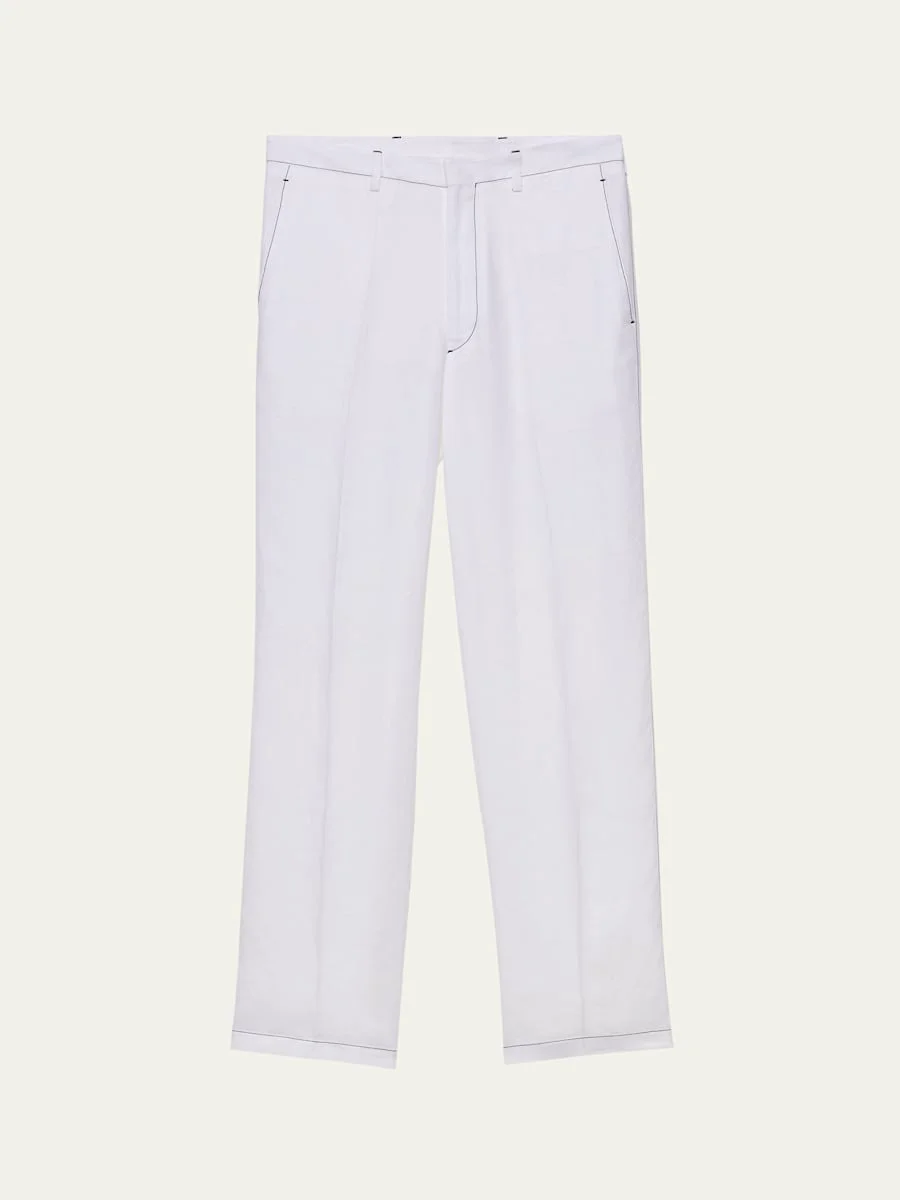 Prada pants made from lightweight linen with refined sartorial details Contrast stitching Regular rise Front slant pockets Back patch pockets Fabic triangle logo on back pocket Full length Straight legs Linen Lining: Cotton Hand wash, wash inside out Made in Italy Online Inquiries: BGS21_ND07K| Store Inquiries: #4987872