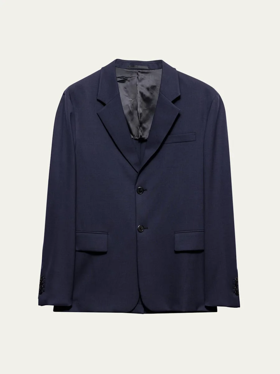 Prada solid stretchwool blazer with tailored construction Notch lapels Twobutton closure Chest welt pocket Hip flap pockets Fourbutton sleeve finish Center back vent Virgin wool/elastane Dry clean Made in Italy