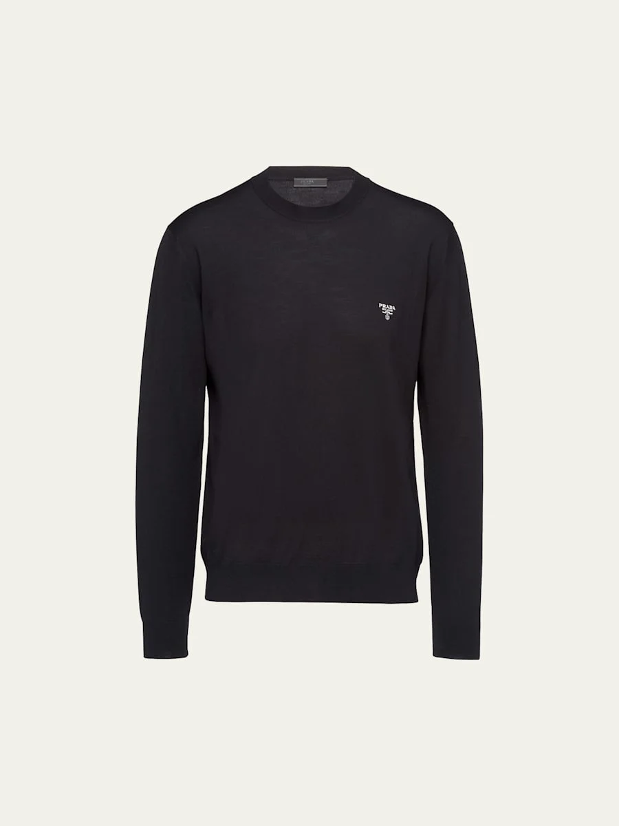 Prada sweater in superfine knit Crew neckline Contrast logo at chest Long sleeves Ribbed trim Pullover style Wool Made in Italy Model is 6'1"/185cm. Online Inquiries: BGS21_N8KZC| Store Inquiries: #4157769