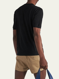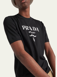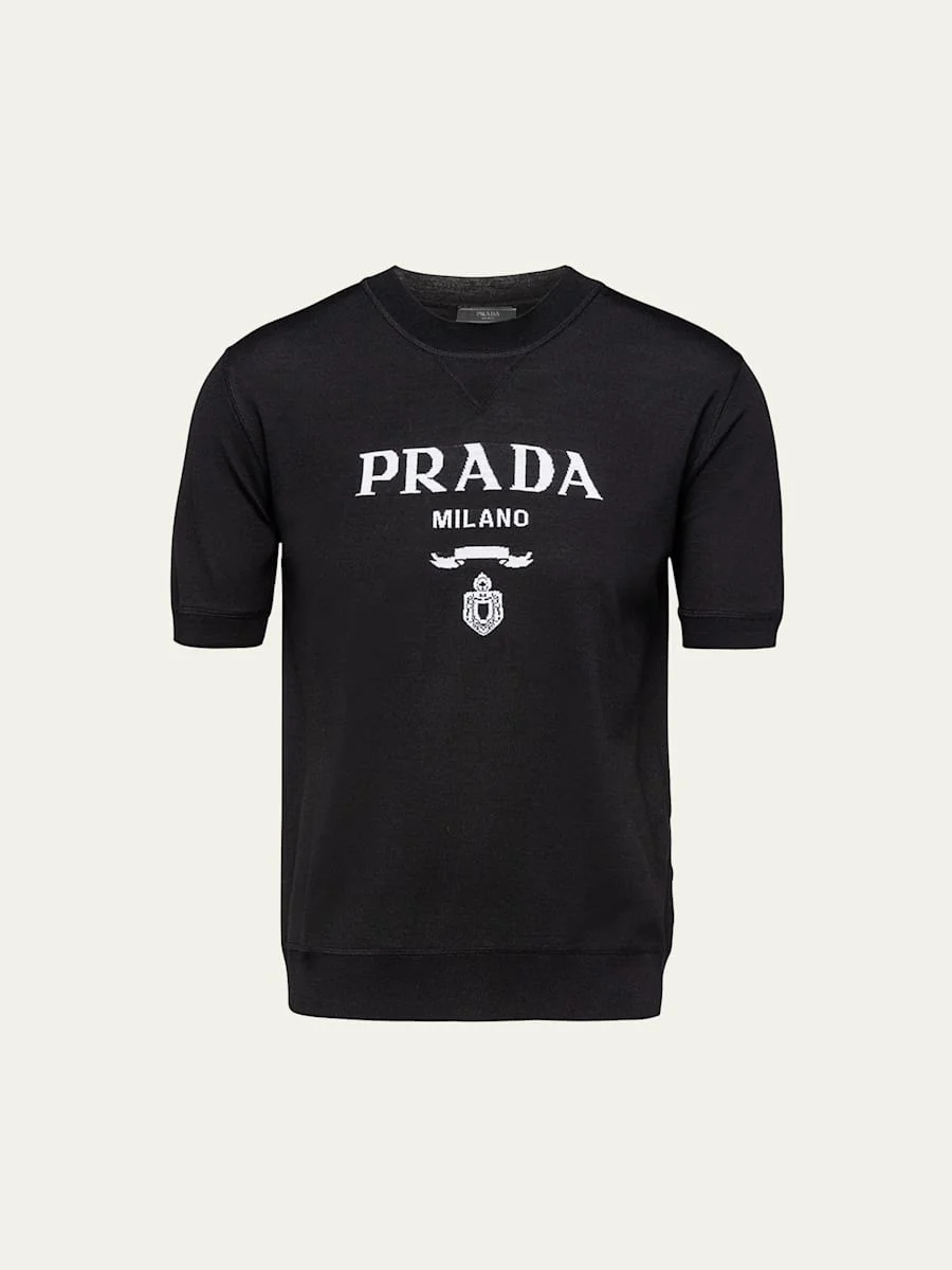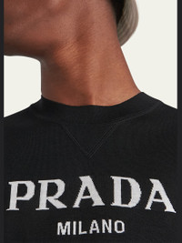 Prada sweater in a superfine knit with a logo at front Crew neckline Short sleeves Ribbed cuffs and hem Pullover style Virgin wool Made in Italy