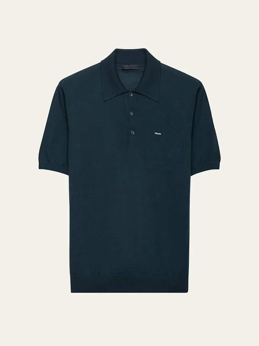 Prada knit polo sweater crafted from superfine virgin wool for a soft and luxurious finish Subtle embroidered chest logo Shirt collar Three-button placket Short sleeves Ribbed cuffs and hem Pullover style Virgin wool Hand wash, professional cleaning recommended Made in Italy Online Inquiries: BGS21_NDSNA| Store Inquiries: #5078088
