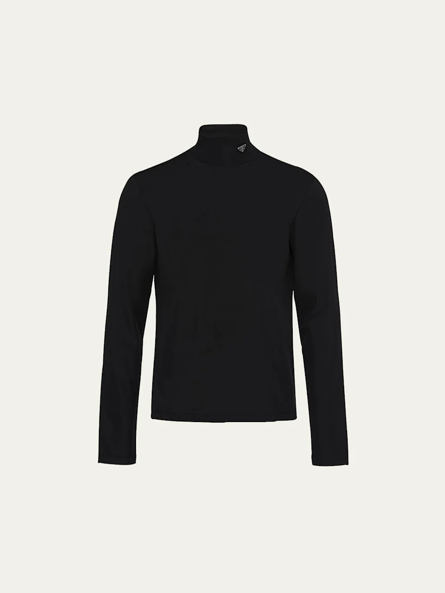 Prada sweater in technical jersey Mock neckline with enameled metal triangle logo Long sleeves Pullover style Nylon/elastane Trim: Leather Made in Italy Model is 6'1"/185cm. Online Inquiries: BGS21_NCU5L| Store Inquiries: #4527782