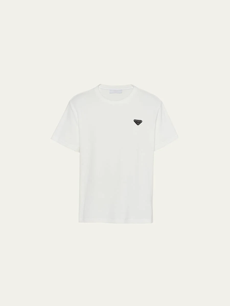 Prada T-shirt in solid terry cloth Enameled metal triangle logo at chest Crew neckline Short sleeves Pullover style Cotton Made in Italy Model is 6'1"/185cm. Online Inquiries: BGS21_NB9CT| Store Inquiries: #4606753