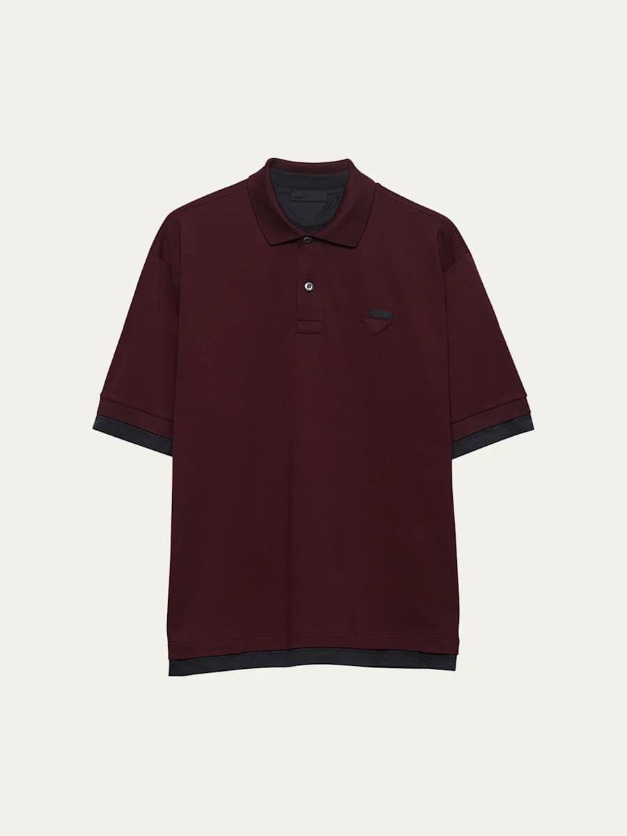 Prada polo shirt in cotton pique with contrast tipping for a layered effect Subtle triangle motif on the chest Spread collar Two-button placket Short sleeves Pullover style Cotton Hand wash, professional cleaning recommended Made in Italy Online Inquiries: BGS21_NDM8Z| Store Inquiries: #5047570
